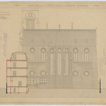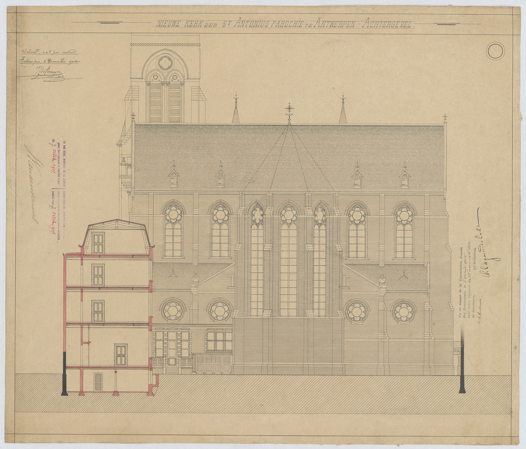 Opschrift: Nieuwe kerk der St. Antonius parochie in Antwerpen. Achtergevel. Omschrijving plan: opstand achtergevel Datum KCML: 8 /04/1905 Archiefnummer: A0120
