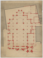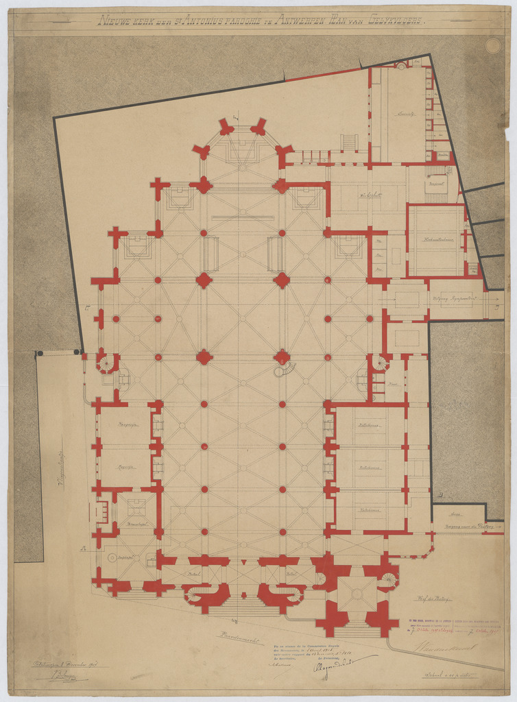 Opschrift: Nieuwe kerk der St. Antonius parochie in Antwerpen. Plan van gelijkvloers. Omschrijving plan: plattegrond niveau 0 Datum KCML: 8 /04/1905 Archiefnummer: A0118