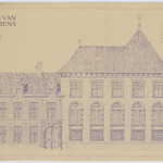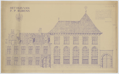 Opschrift: Het huis van P.P. Rubens. Stad Antwerpen. Dienst der stadsgebouwen. Gevels vd woning en het schildershuis ad straat. Omschrijving plan: opstand voorgevel Datum KCML: deze informatie wordt niet vermeld op het archiefstuk Archiefnummer: A0281