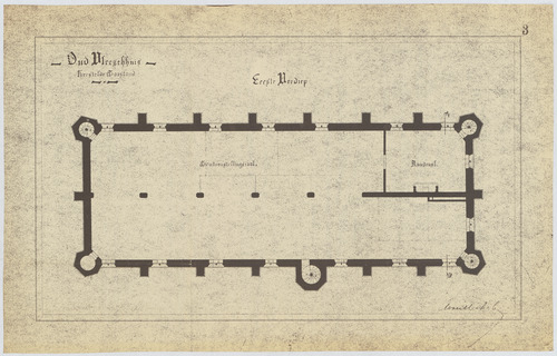 Opschrift: Oud Vleeschhuis. Herstelde toestand. Eerste verdiep. Omschrijving plan: plattegrond niveau 1 Datum KCML: deze informatie wordt niet vermeld op het archiefstuk Archiefnummer: A0272