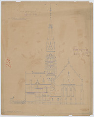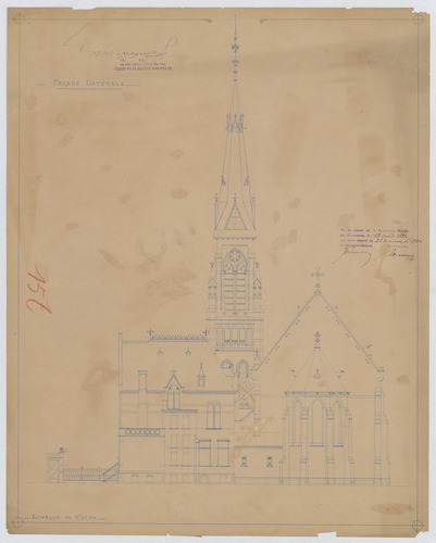 Opschrift: Plan général de l'Eglise protestante évangelique allemande d'Anvers. Façade latérale. Omschrijving plan: opstand zijgevel 1 Datum KCML: 13/08/1891 Archiefnummer: A0222