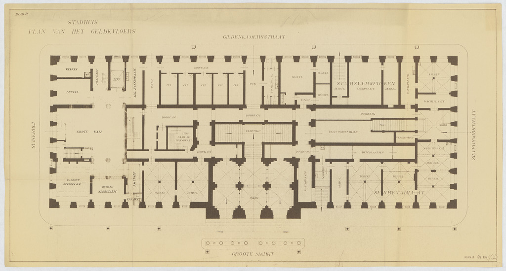 Opschrift: Stadhuis. Plan van het gelijkvloers. Omschrijving plan: plattegrond niveau 0 Datum KCML: deze informatie wordt niet vermeld op het archiefstuk Archiefnummer: A0241