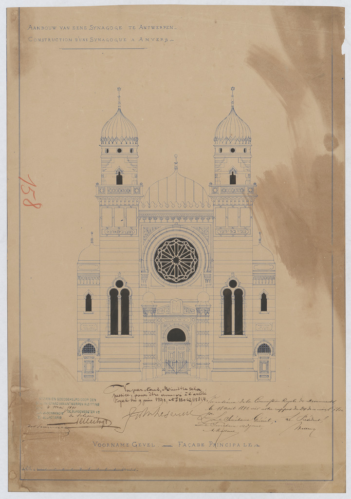 Opschrift: Aanbouw van eene Synagoge te Antwerpen.Voorname gevel. Omschrijving plan: opstand voorgevel Datum KCML: 18/04/1891 Archiefnummer: A0229