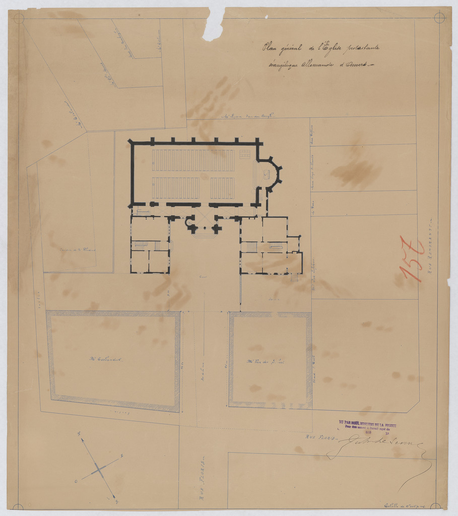 Opschrift: Plan général de l'Eglise protestante évangelique allemande d'Anvers. Omschrijving plan: situatieplan Datum KCML: 13/08/1891 Archiefnummer: A0215