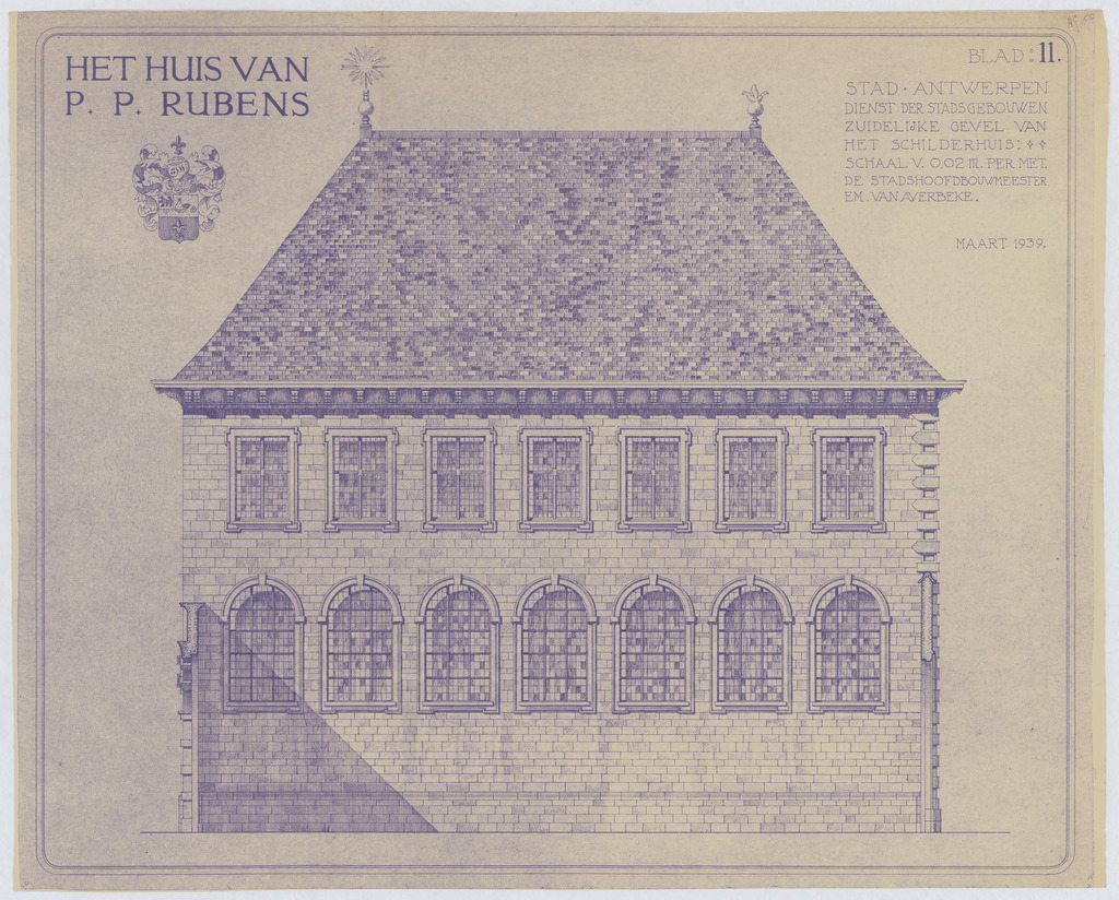 Opschrift: Het huis van P.P. Rubens. Stad Antwerpen. Dienst der stadsgebouwen. Zuidelijke gevel van het schilderhuis. Omschrijving plan: opstand Z-gevel Datum KCML: deze informatie wordt niet vermeld op het archiefstuk Archiefnummer: A0288