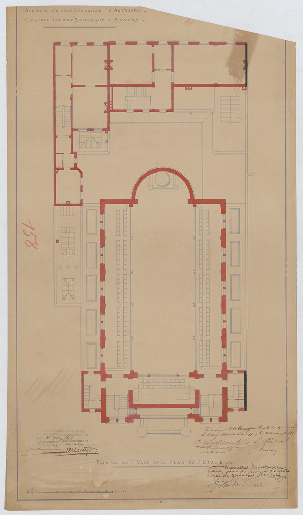 Opschrift: Aanbouw van eene Synagoge te Antwerpen. Plan van het 1e verdiep. Omschrijving plan: plattegrond niveau 1 Datum KCML: 18/04/1891 Archiefnummer: A0227