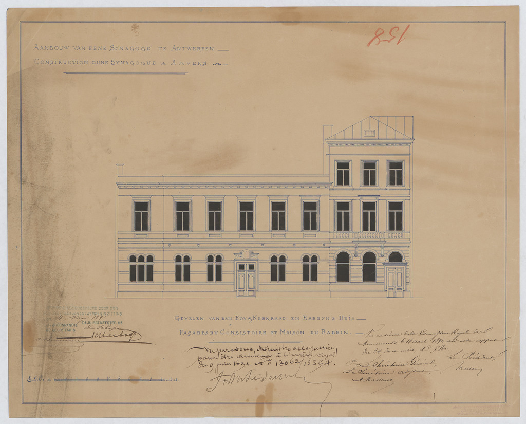 Opschrift: Aanbouw van eene Synagoge te Antwerpen. Gevelen van den Bouwkerkraad en het Rabbyns Huis. Omschrijving plan: opstand voorgevel Datum KCML: 18/04/1891 Archiefnummer: A0232