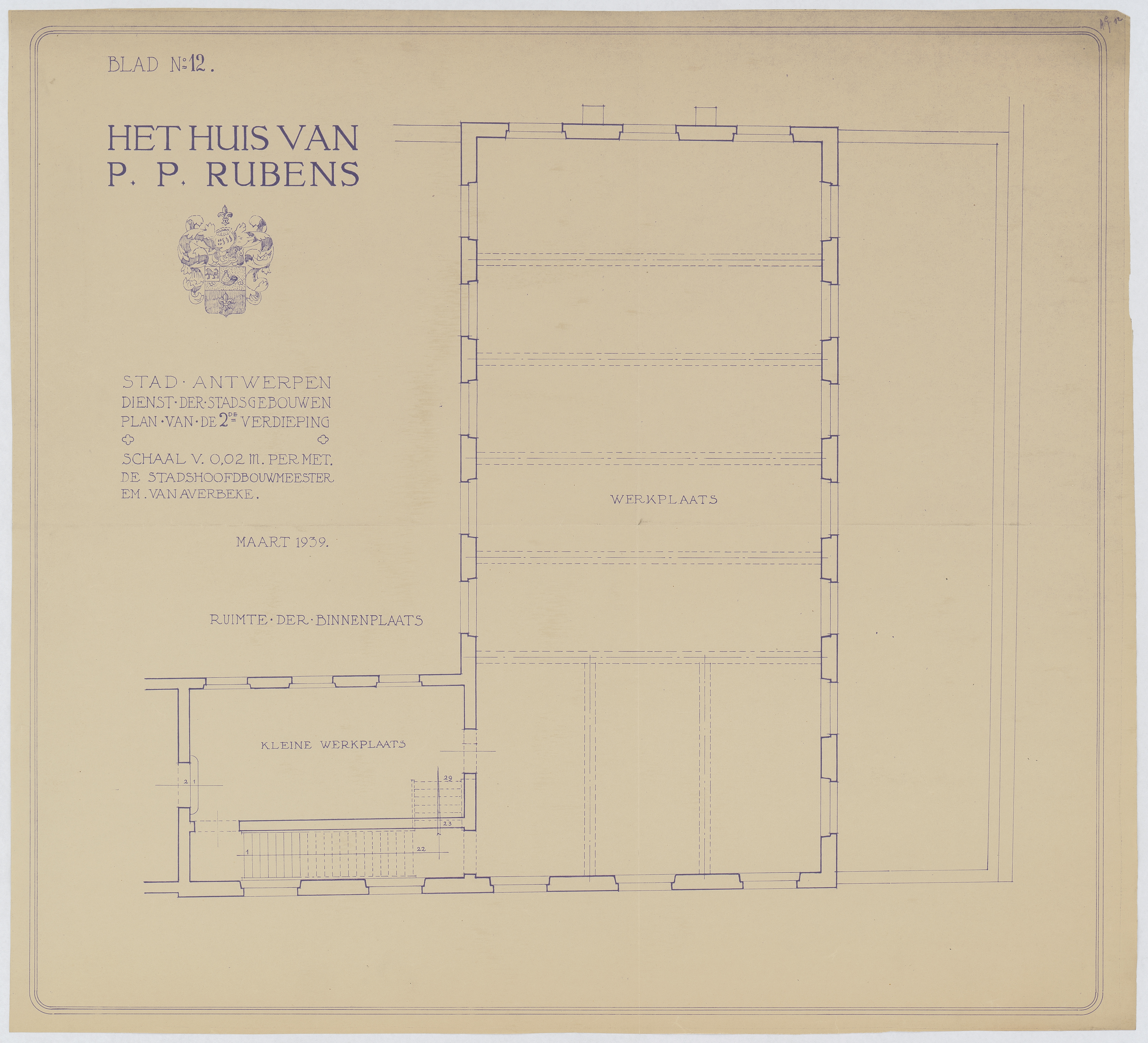 Opschrift: Het huis van P.P. Rubens. Stad Antwerpen. Dienst der stadsgebouwen. Plan van de 2de verdieping. Omschrijving plan: plattegrond niveau 2 Datum KCML: deze informatie wordt niet vermeld op het archiefstuk Archiefnummer: A0289