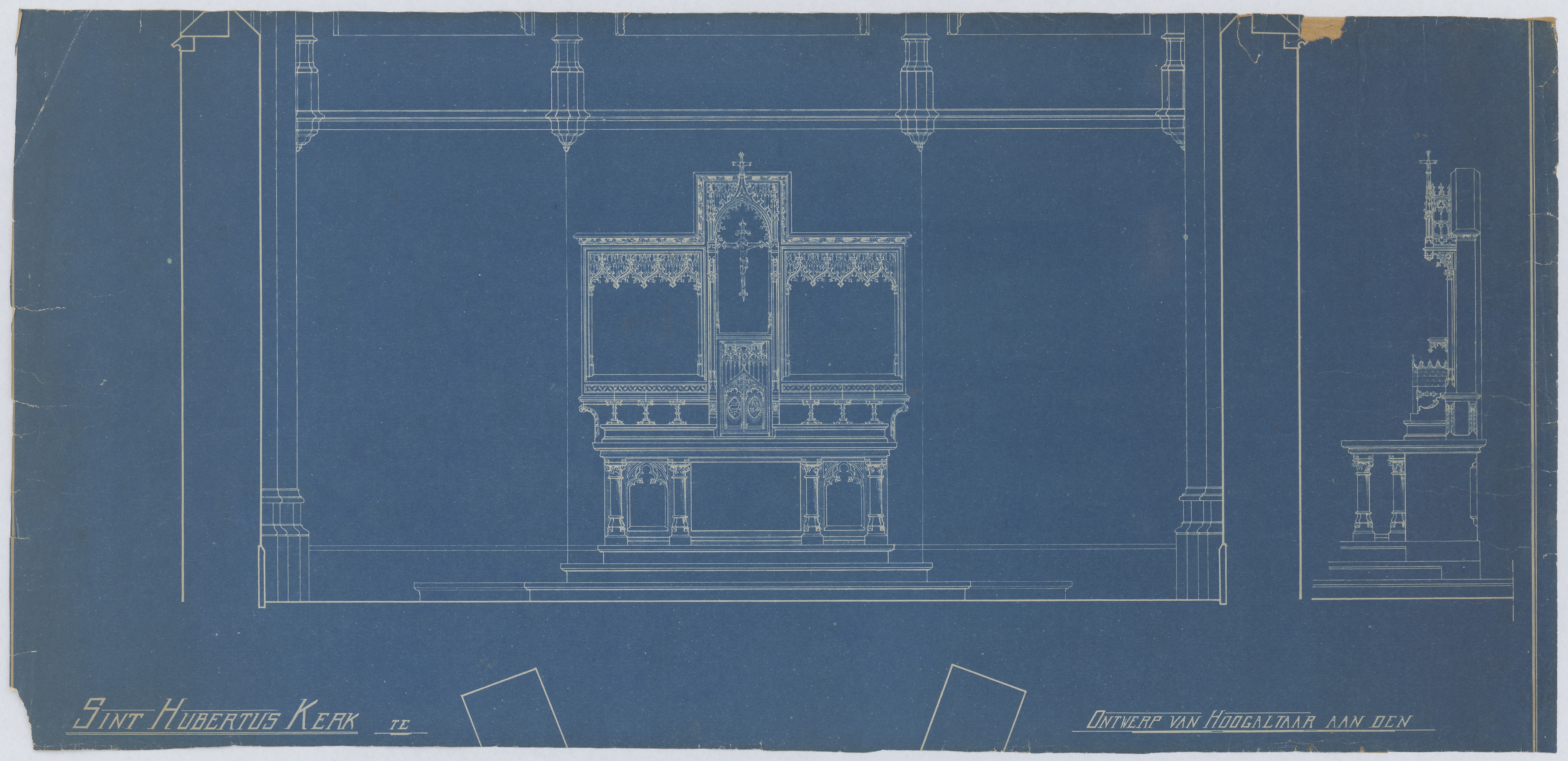 Opschrift: Sint Hubertus Kerk te... Ontwerp van Hoogaltaar aan den… Omschrijving plan: voor- en zijaanzicht altaar Datum KCML: deze informatie wordt niet vermeld op het archiefstuk Archiefnummer: A0372