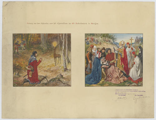 Opschrift: Ontwerp van twee taferelen voor het chooraltaar der Ste.-Hubertuskerk te Berchem. Omschrijving plan: ontwerp schilderij Datum KCML: 26/03/1921 Archiefnummer: A0373