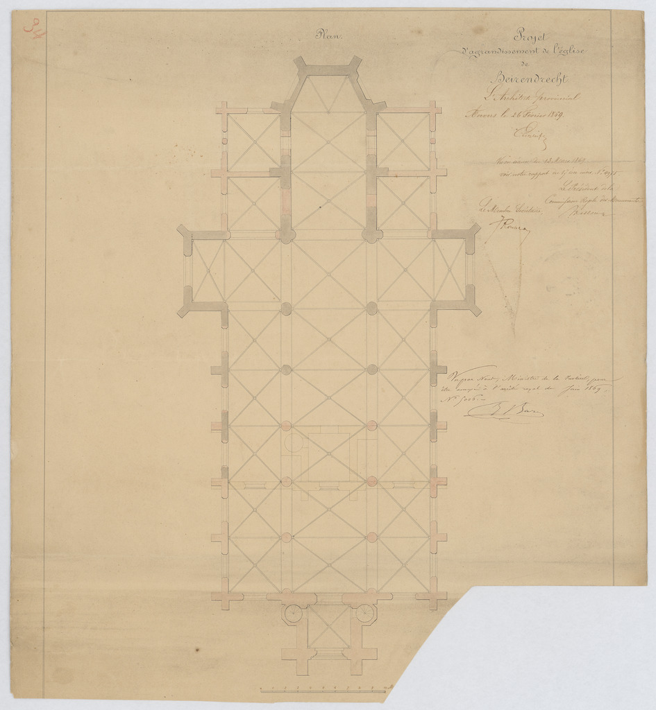 Opschrift: Projet d'agrandissement de l'église de Berendrecht. Omschrijving plan: plattegrond niveau 0 Datum KCML: 13/03/1869 Archiefnummer: A0359