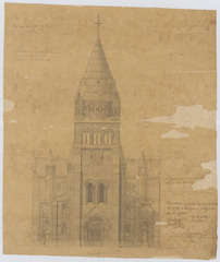 Opschrift: Kerk van den H. Joannes te Borgerhout. Omschrijving plan: opstand voorgevel Datum KCML: 23/10/1888 Archiefnummer: A0386