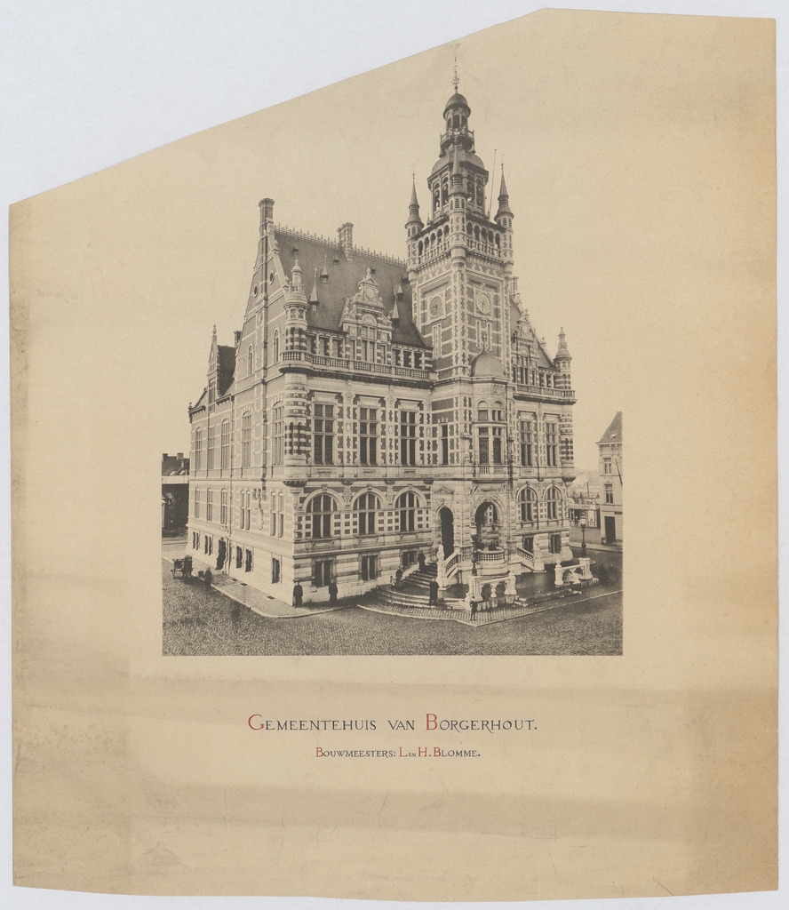 Opschrift: Gemeentehuis van Borgerhout. Bouwmeesters: L. en H. Blomme Omschrijving plan: foto voorgevel Datum KCML: deze informatie wordt niet vermeld op het archiefstuk Archiefnummer: A0392