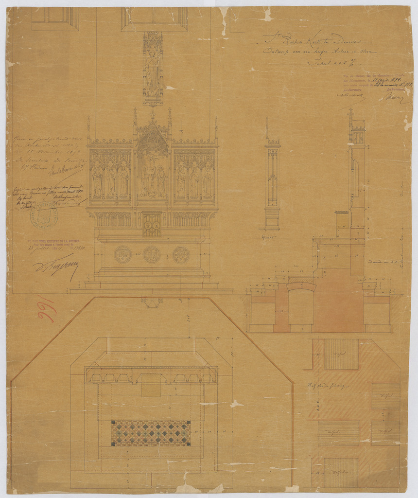 Opschrift: St. Rochus te Deurne. Ontwerp voor een hoogen altaar in steen. Omschrijving plan: plattegrond, voor- en zijaanzicht en doorsnede altaar Datum KCML: 21/04/1894 Archiefnummer: A0410