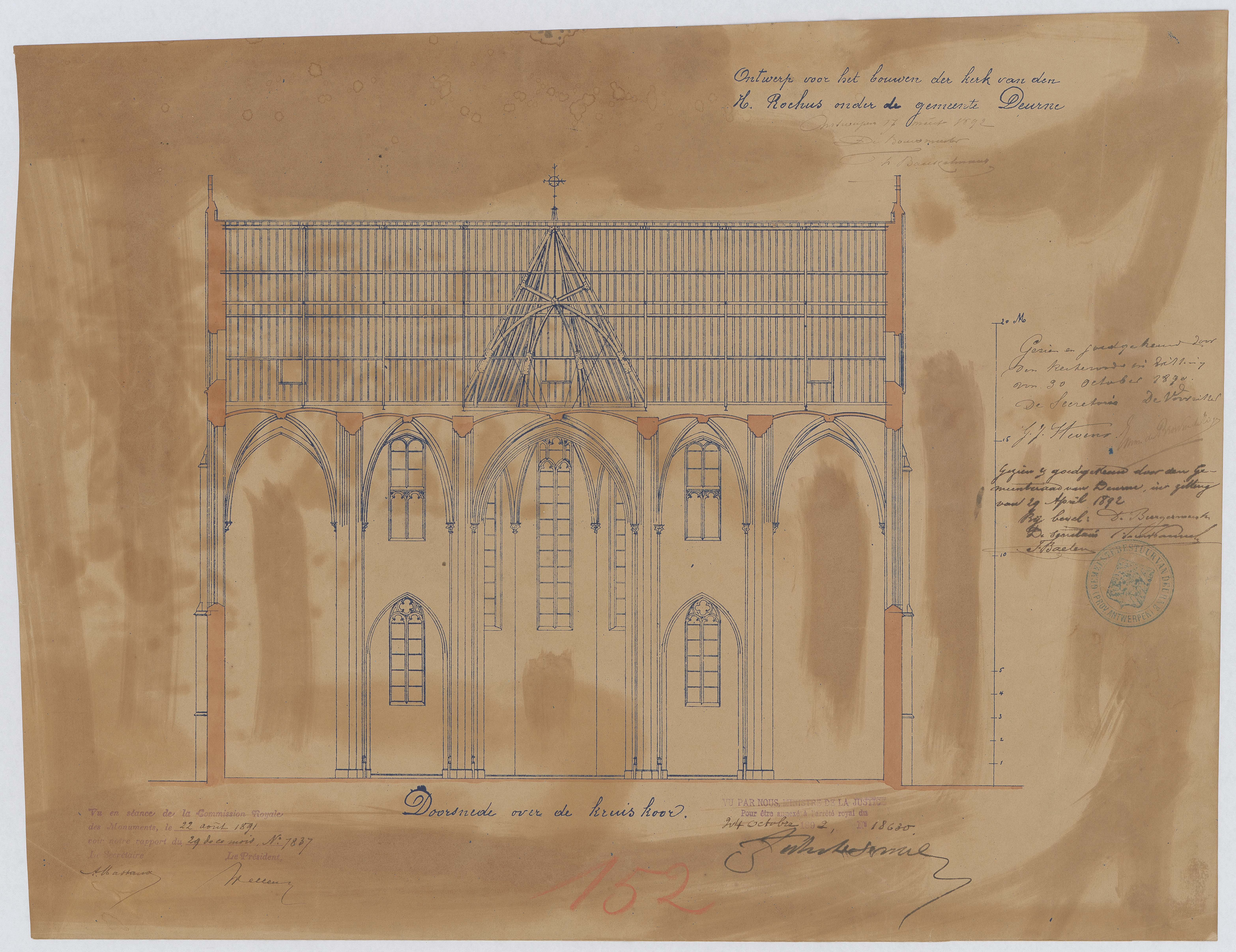 Opschrift: Ontwerp voor het bouwen der kerk van den H. Rochus onder de gemeente Deurne. Omschrijving plan: dwarsdoorsnede Datum KCML: 22/08/1891 Archiefnummer: A0403