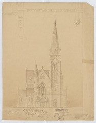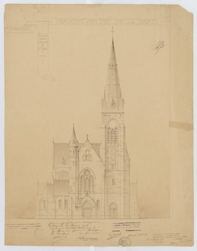 Opschrift: Hoboken. Parochie van het H. Hart. Ontwerp voor nieuwe kerk. Omschrijving plan: opstand voorgevel Datum KCML: 26/06/1909 Archiefnummer: A0445