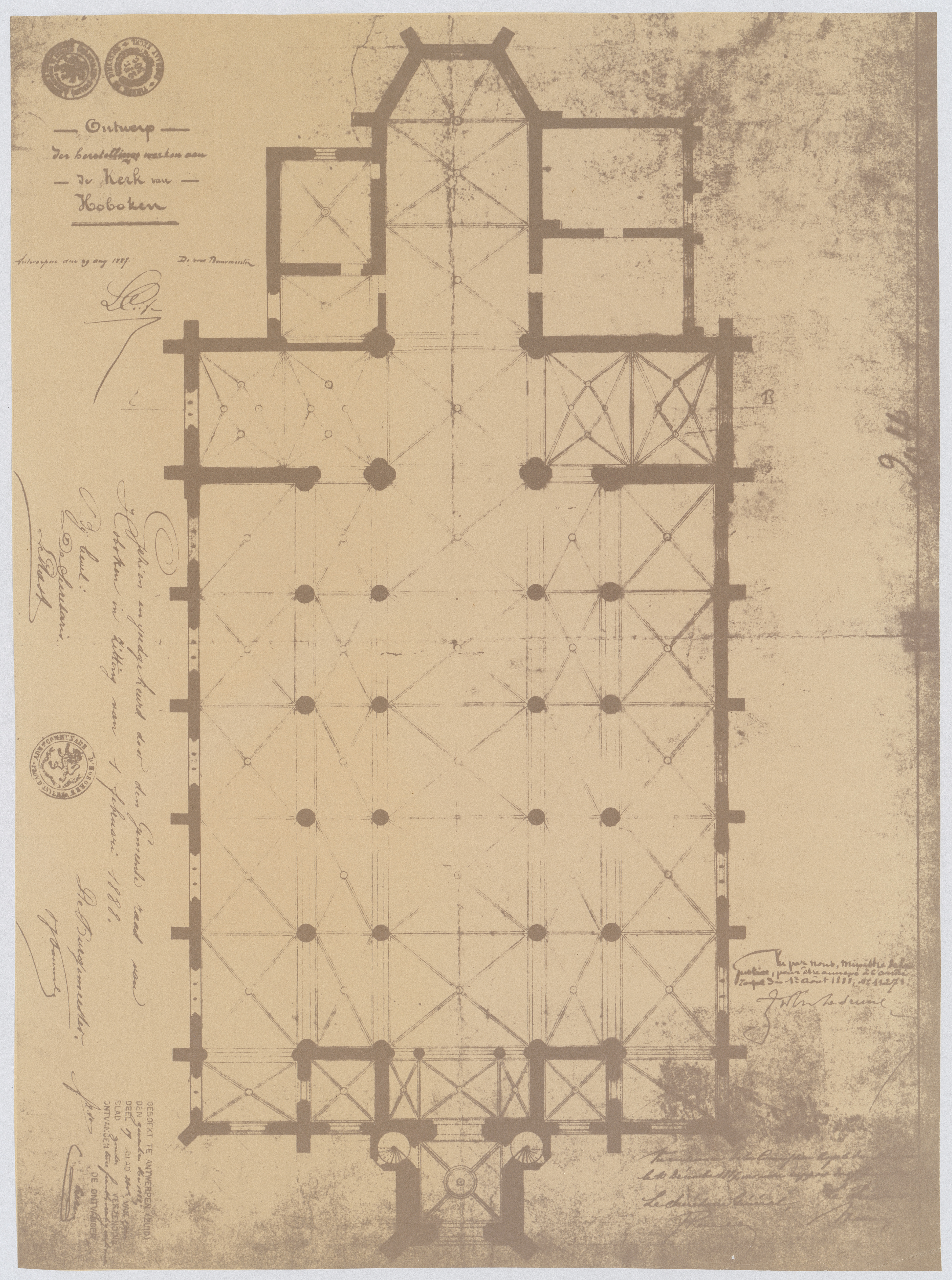 Opschrift: Ontwerp der herstellingswerken aan de kerk van Hoboken. Omschrijving plan: plattegrond niveau 0 Datum KCML: 10/12/1887 Archiefnummer: A0441