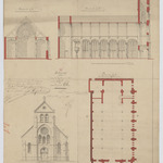 Opschrift: Ontwerp voor het herbouwen der kerk van het fort Lillo. Omschrijving plan: plattegrond niveau 0, opstand voorgevel, langsdoorsnede, dwarsdoorsnede Datum KCML: 2 /09/1882 Archiefnummer: A0451