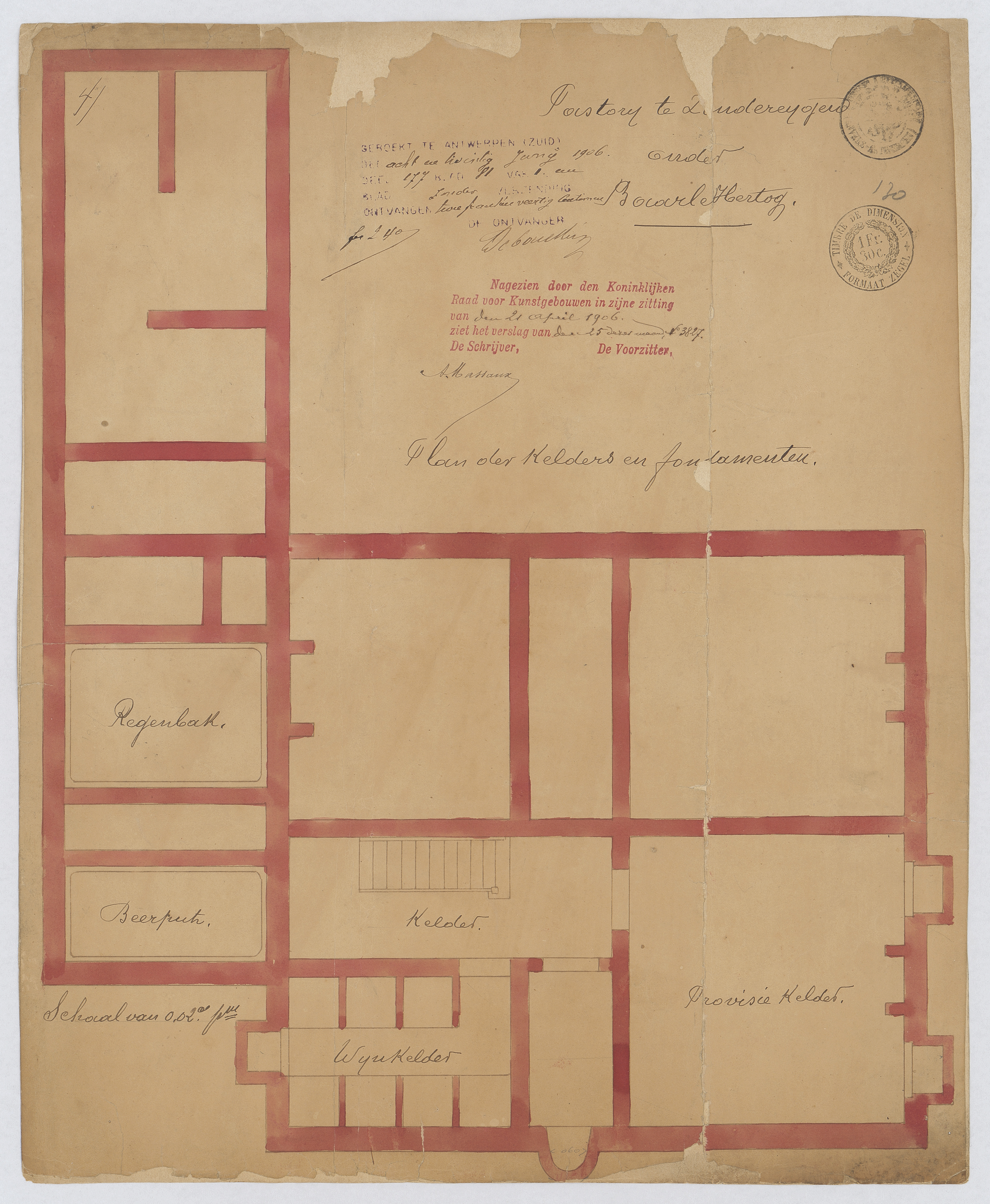 Opschrift: Pastorij te Zondereygen onder Baarle-Hertog. Omschrijving plan: plattegrond niveau -1 Datum KCML: 21/04/1906 Archiefnummer: A0483