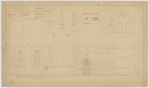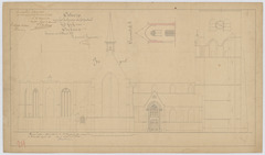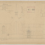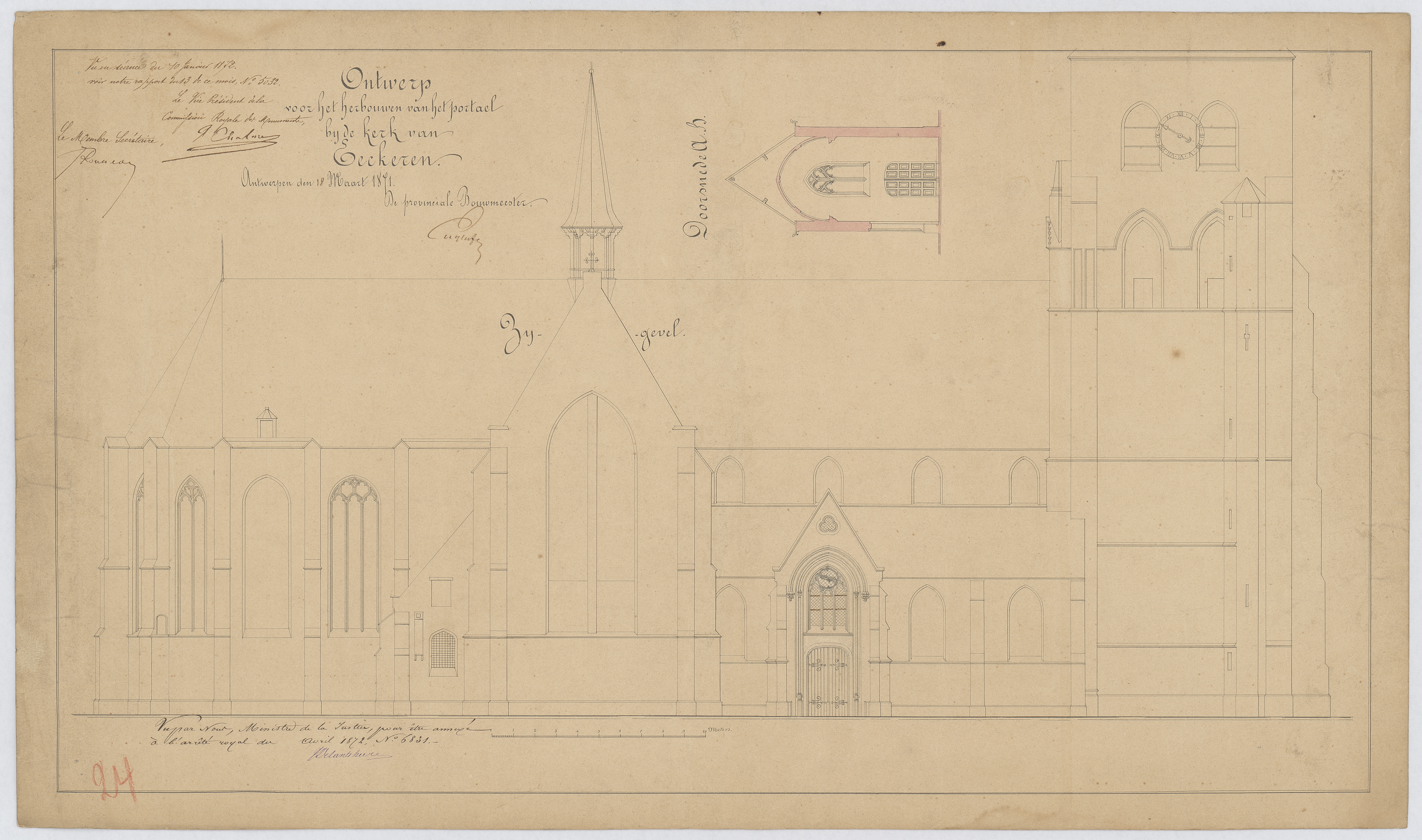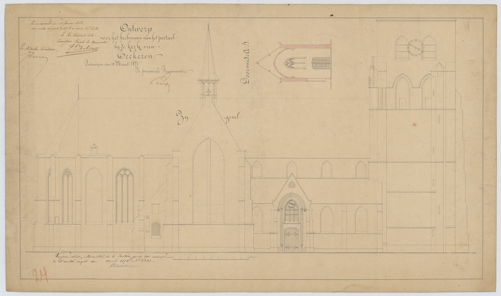 Opschrift: Ontwerp voor het herbouwen van het portael bij de kerk van Eeckeren. Omschrijving plan: opstand zijgevel 1, dwarsdoorsnede portaal Datum KCML: 10/01/1872 Archiefnummer: A0422