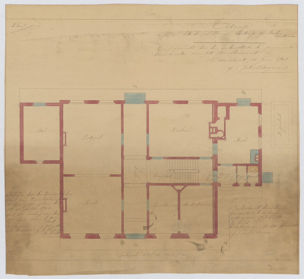 Opschrift: Ontwerp voot het bouwen eener Pastorij te Baelen Centrum. Omschrijving plan: plattegrond niveau 0 Datum KCML: 23/08/1902 Archiefnummer: A0491