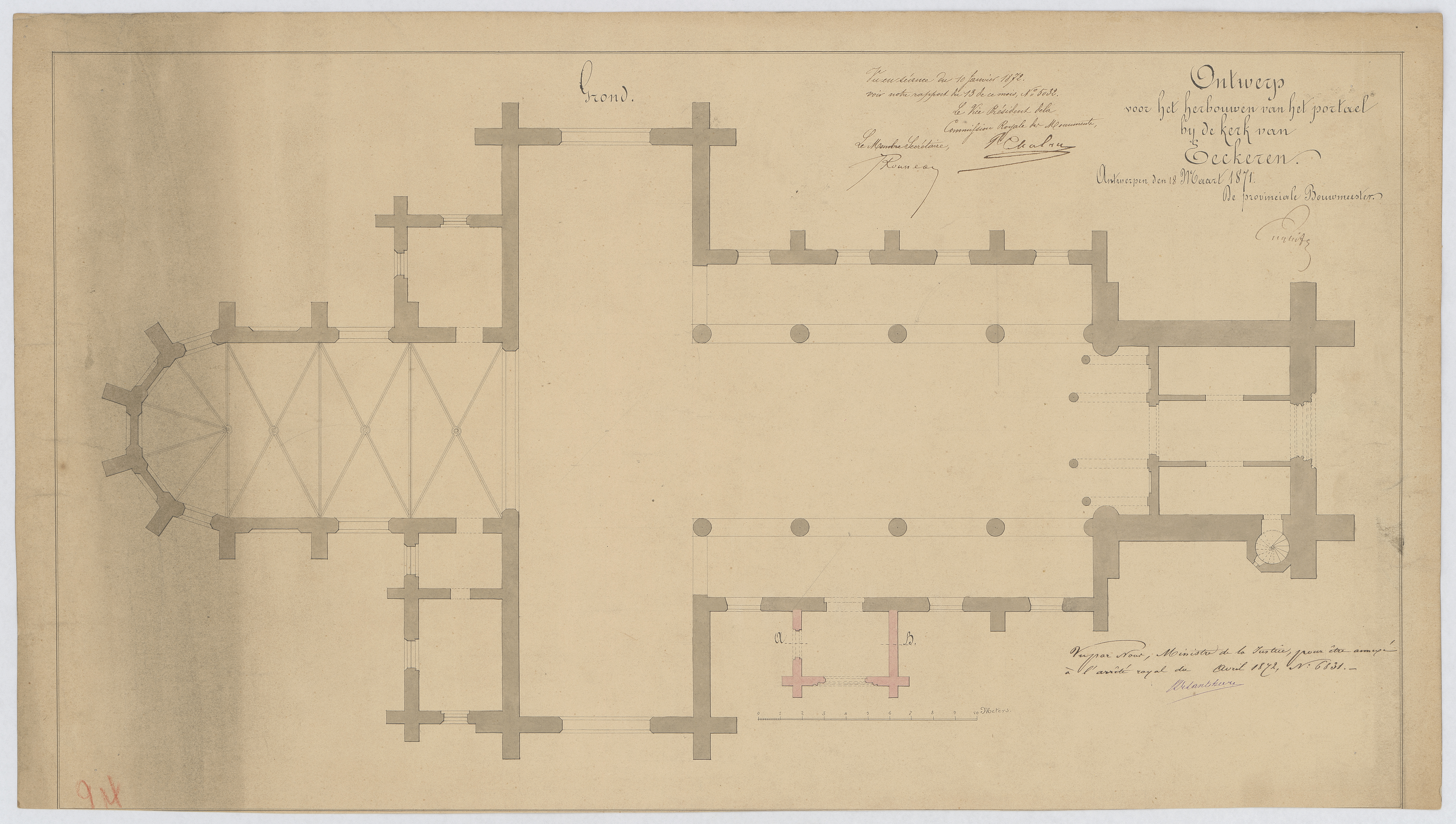 Opschrift: Ontwerp voor het herbouwen van het portael bij de kerk van Eeckeren. Omschrijving plan: plattegrond niveau 0 Datum KCML: 10/01/1872 Archiefnummer: A0421