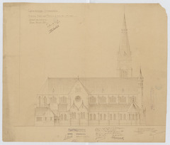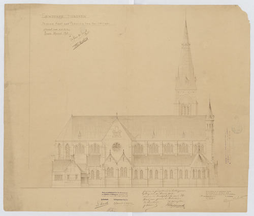 Opschrift: Gemeente Hoboken. Nieuwe kerk der Parochie van het Heilig Hart. Omschrijving plan: opstand zijgevel 2 Datum KCML: 26/06/1909 Archiefnummer: A0448