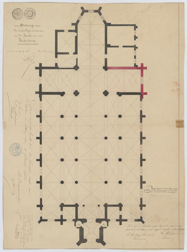 Opschrift: Ontwerp der herstellingswerken aan de kerk van Hoboken. Omschrijving plan: plattegrond niveau 0 Datum KCML: 10/12/1887 Archiefnummer: A0439