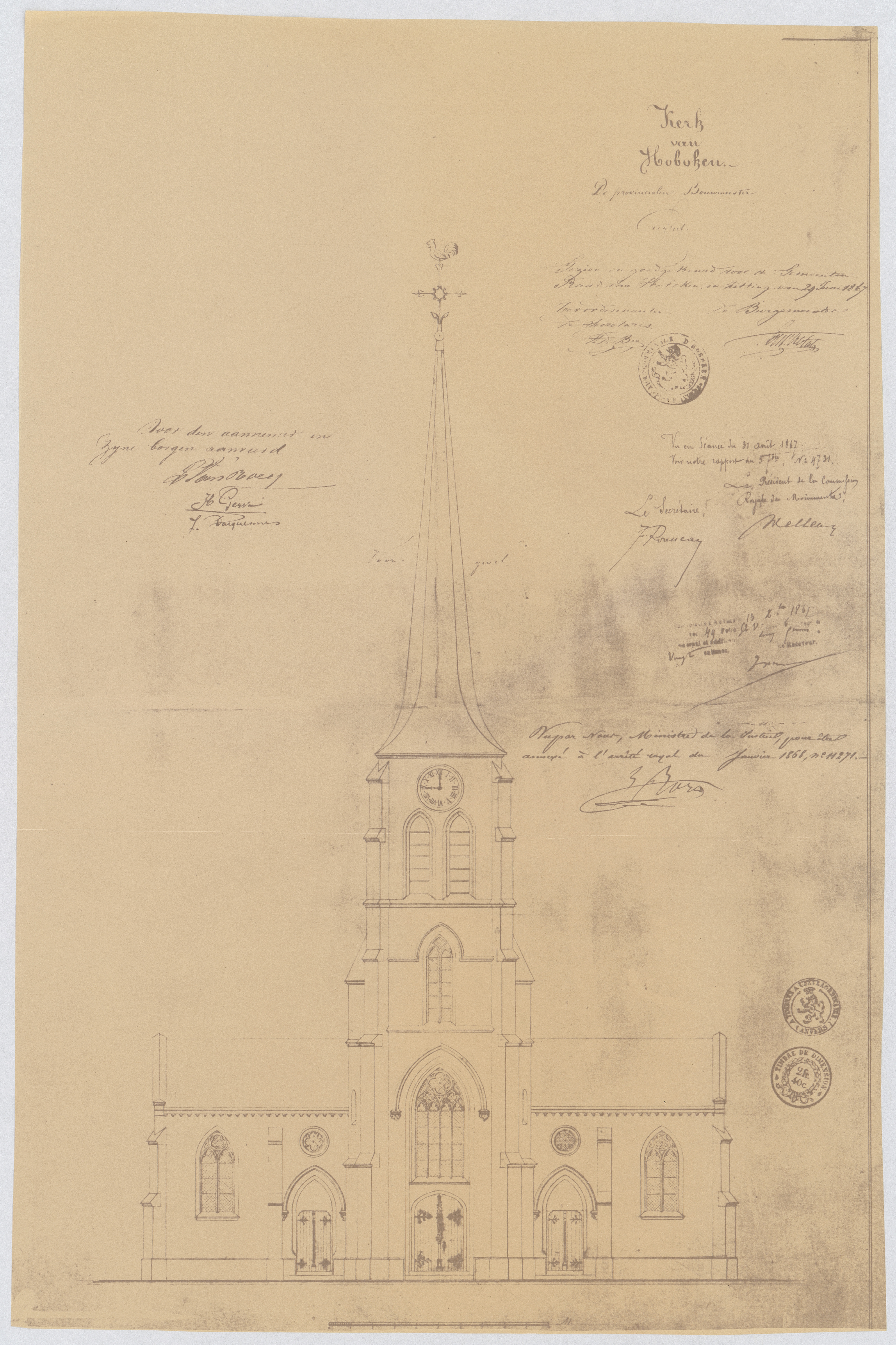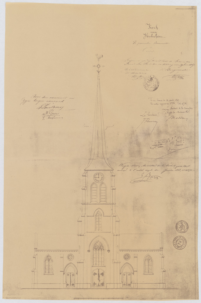 Opschrift: Kerk van Hoboken. Omschrijving plan: opstand voorgevel Datum KCML: 31/08/1867 Archiefnummer: A0436