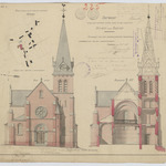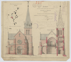 Opschrift: Ontwerp voor het bouwen eener kerk op het gehucht Hulsen onder Baelen. Omschrijving plan: opstand voorgevel, dwarsdoorsnede situatieplan Datum KCML: 9 /01/1897 Archiefnummer: A0506