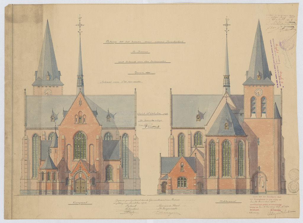Opschrift: Ontwerp tot het bouwen eener nieuwe Parochiekerk te Beerse met behoud van den bestaanden Toren. Omschrijving plan: opstand voorgevel, opstand achtergevel Datum KCML: 29/12/1906 Archiefnummer: A0526