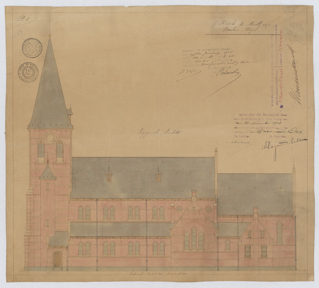 Opschrift: Kerk te Moll en Baelen-Wezel. Omschrijving plan: opstand zijgevel 1 Datum KCML: 21/11/1903 Archiefnummer: A0521