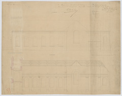 Opschrift: Kerk van Brasschaet. Omschrijving plan: opstand zijgevel 1, langsdoorsnede Datum KCML: 4 /02/1864 Archiefnummer: A0586