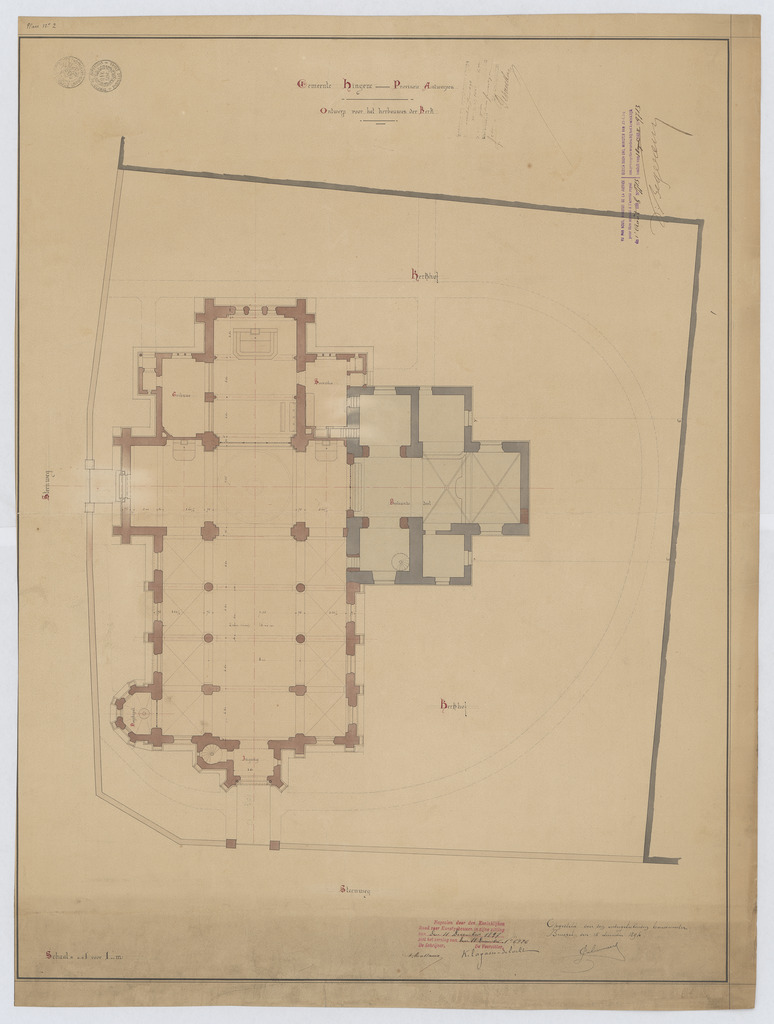 Opschrift: Gemeente Hingene. Provincie Antwerpen. Ontwerp voor het herbouwen der kerk. Omschrijving plan: plattegrond niveau 0 Datum KCML: 4 /12/1897 Archiefnummer: A0580