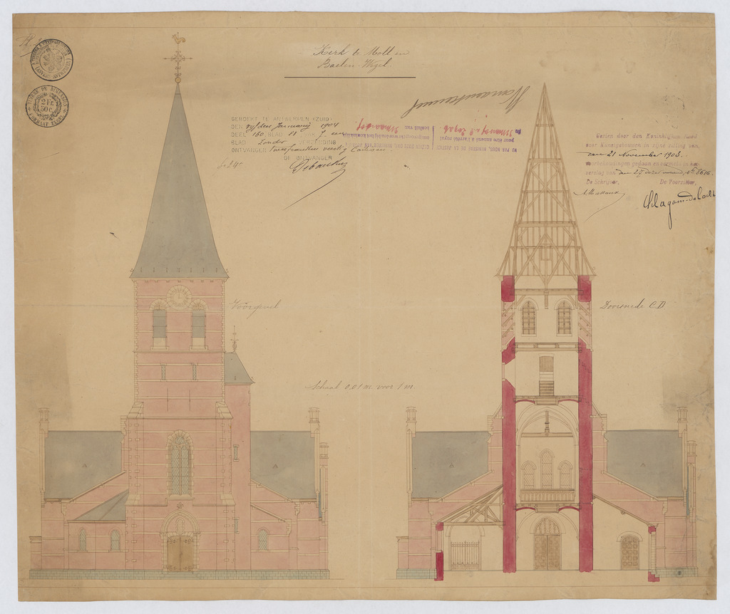 Opschrift: Kerk te Moll en Baelen-Wezel. Omschrijving plan: opstand voorgevel, dwarsdoorsnede naar portaal Datum KCML: 21/11/1903 Archiefnummer: A0520