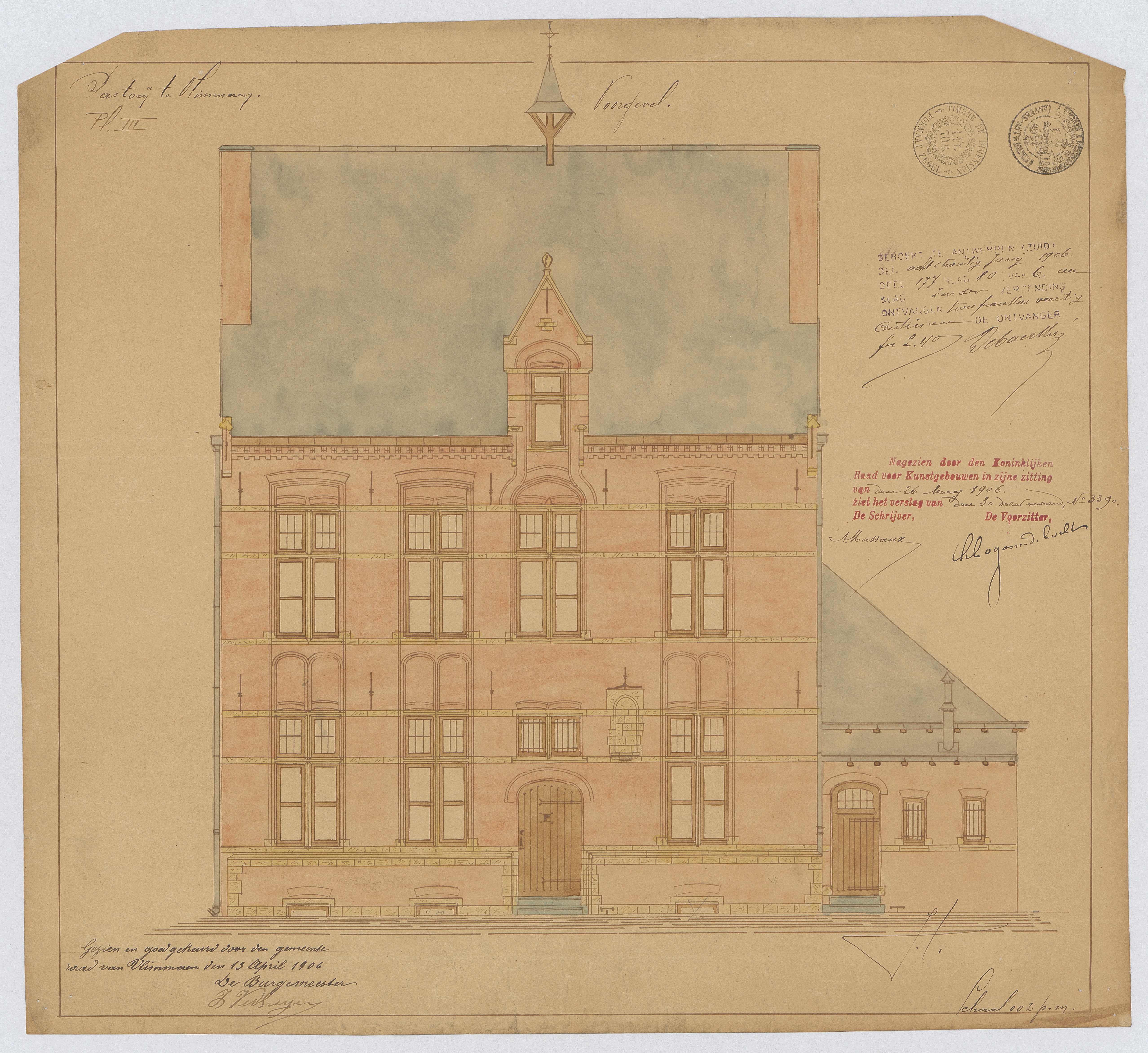 Opschrift: Pastorij te Vlimmeren. Omschrijving plan: opstand voorgevel Datum KCML: 26/05/1906 Archiefnummer: A0533