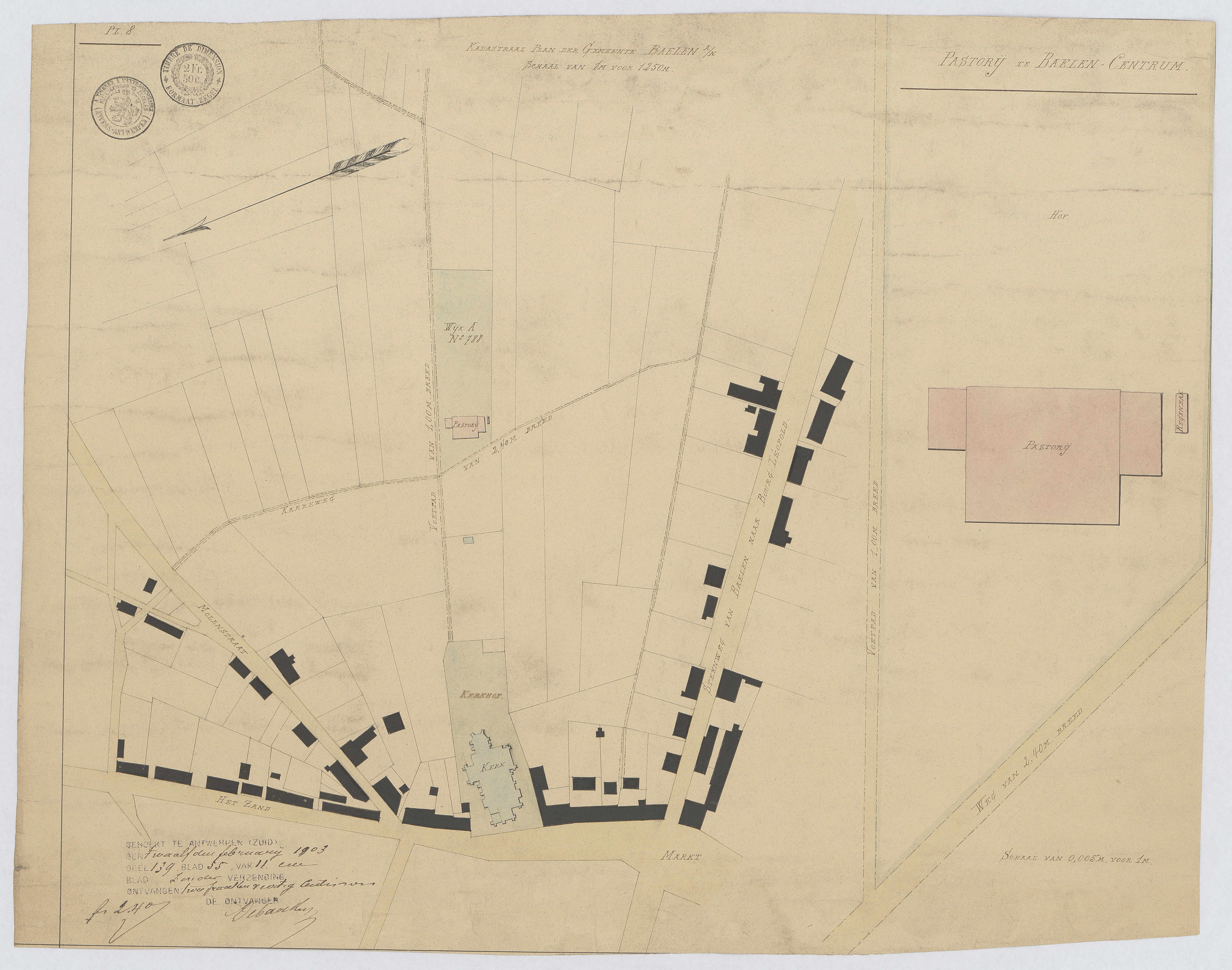 Opschrift: Pastorij te Baelen Centrum. Omschrijving plan: situatieplan, kadasterplan Datum KCML: 23/08/1902 Archiefnummer: A0505