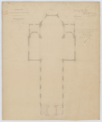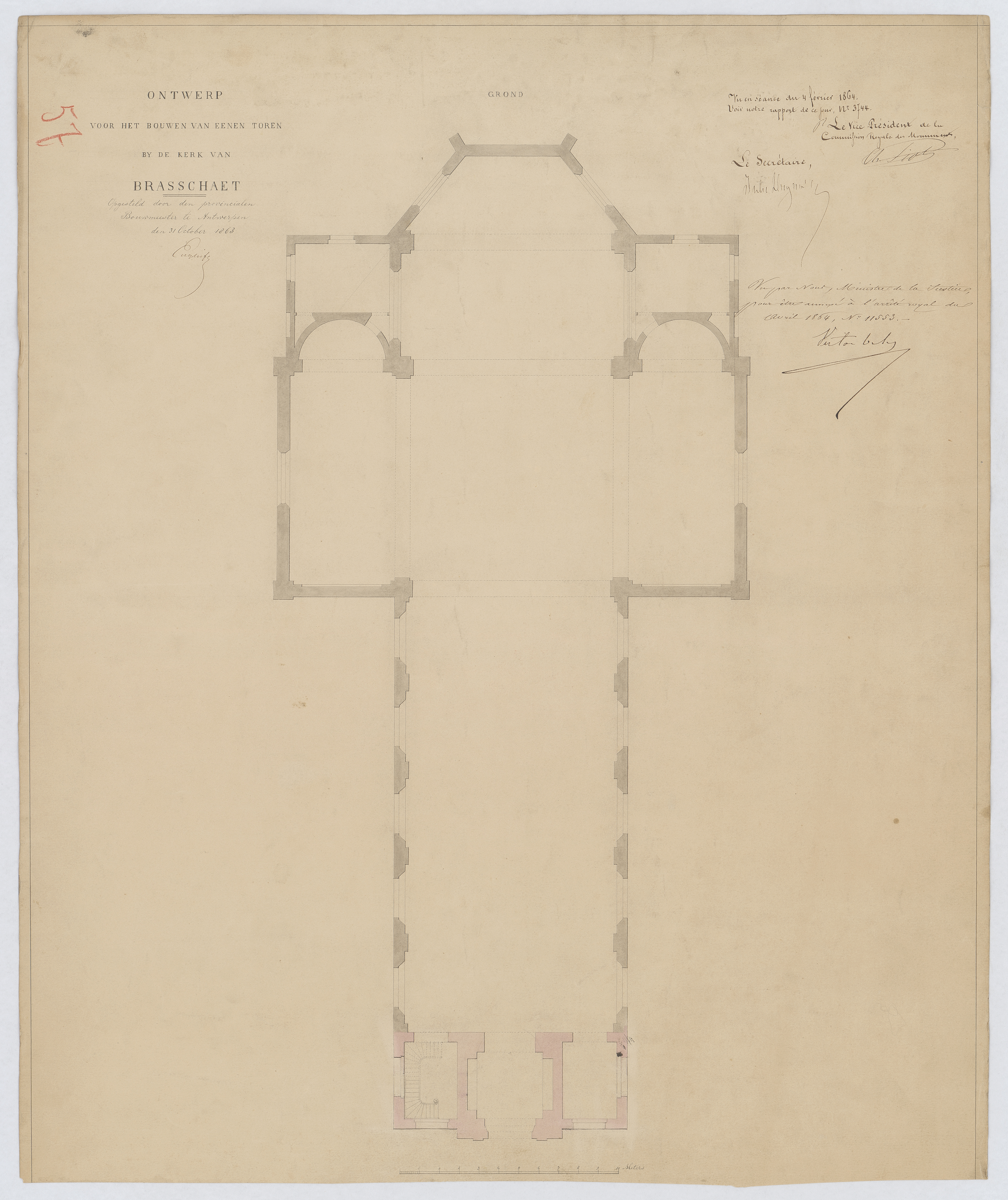 Opschrift: Ontwerp voor het bouwen van eener toren by de kerk van Brasschaet. Omschrijving plan: plattegrond niveau 0 Datum KCML: 4 /02/1864 Archiefnummer: A0584