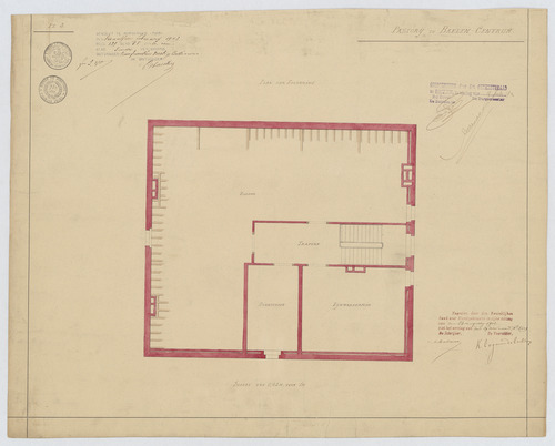 Drager: papier Techniek: pen, opgehoogd met aquarel Afmetingen (h x b in mm): 443 x 540 mm Schaal: 1/50