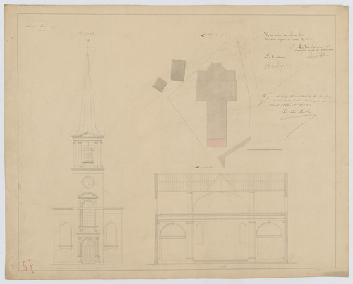 Opschrift: Kerk van Brasschaet. Omschrijving plan: opstand voorgevel, situatieplan, dwarsdoorsnede Datum KCML: 4 /02/1864 Archiefnummer: A0585