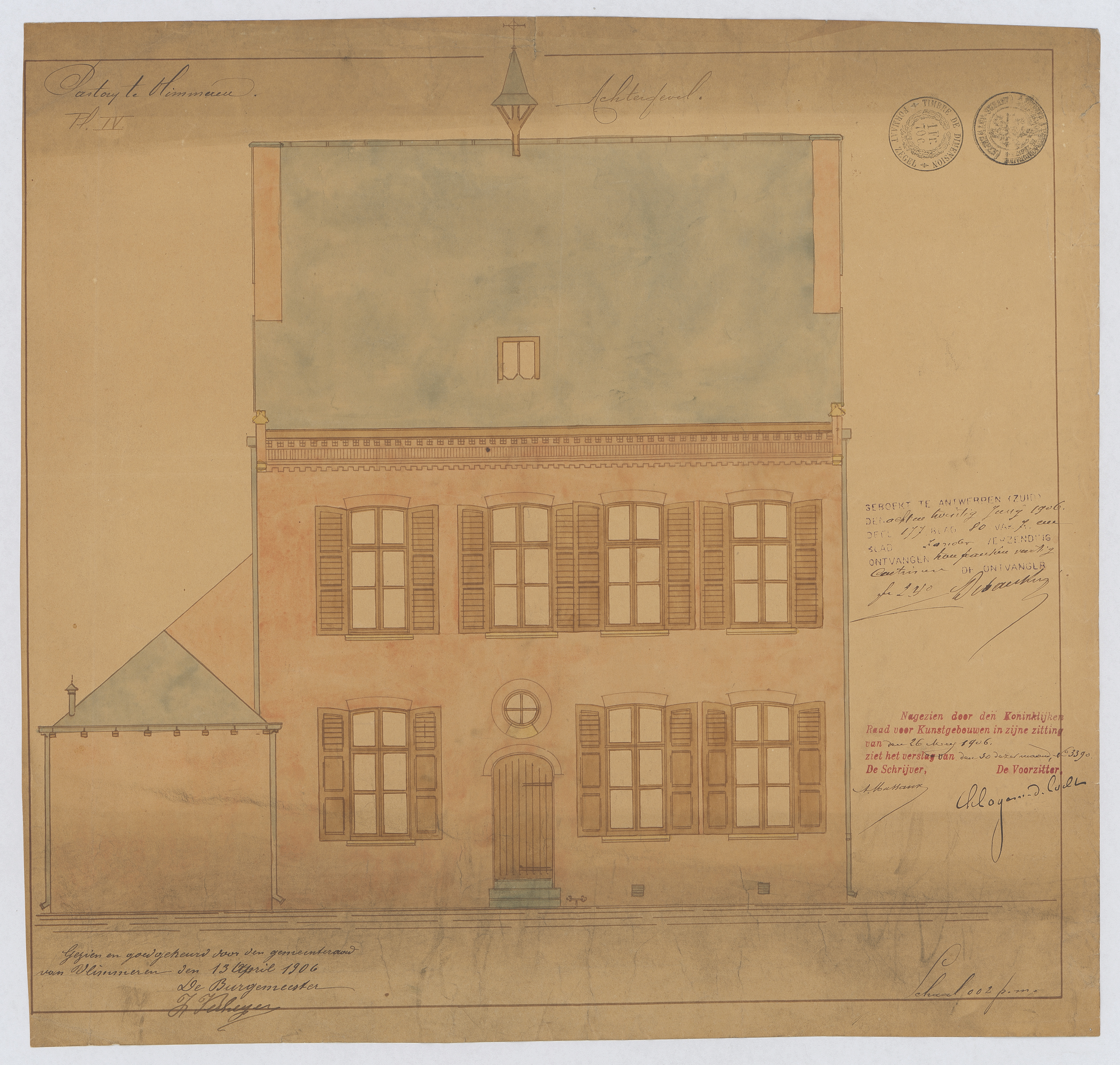 Opschrift: Pastorij te Vlimmeren. Omschrijving plan: opstand achtergevel Datum KCML: 26/05/1906 Archiefnummer: A0534