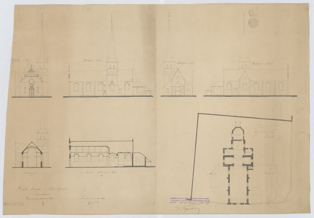 Opschrift: Gemeente Hingene. Provincie Antwerpen. Tegenwoordige staat der kerk. Omschrijving plan: opstand voorgevel, opstand achtergevel, opstand zijgevel zuid, opstand zijgevel noord plattegrond niveau 0, langsdoorsnede dwarsdoorsnede Datum KCML: deze informatie wordt niet vermeld op het archiefstuk Archiefnummer: A0578
