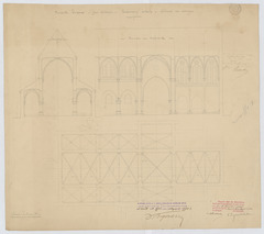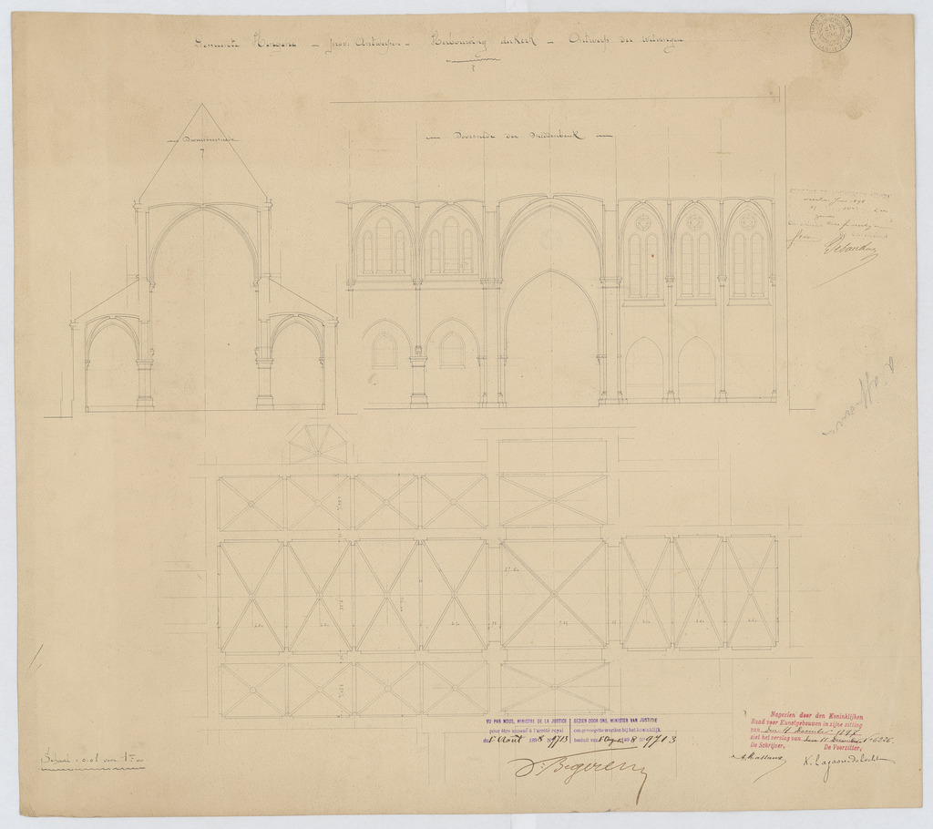 Opschrift: Gemeente Hingene. Prov. Antwerpen. Herbouwing der kerk. Ontwerp der welvingen. Omschrijving plan: dwarsdoorsnede, doorsnede over de middenbeuk, plattegrond gewelven Datum KCML: 4 /12/1897 Archiefnummer: A0579