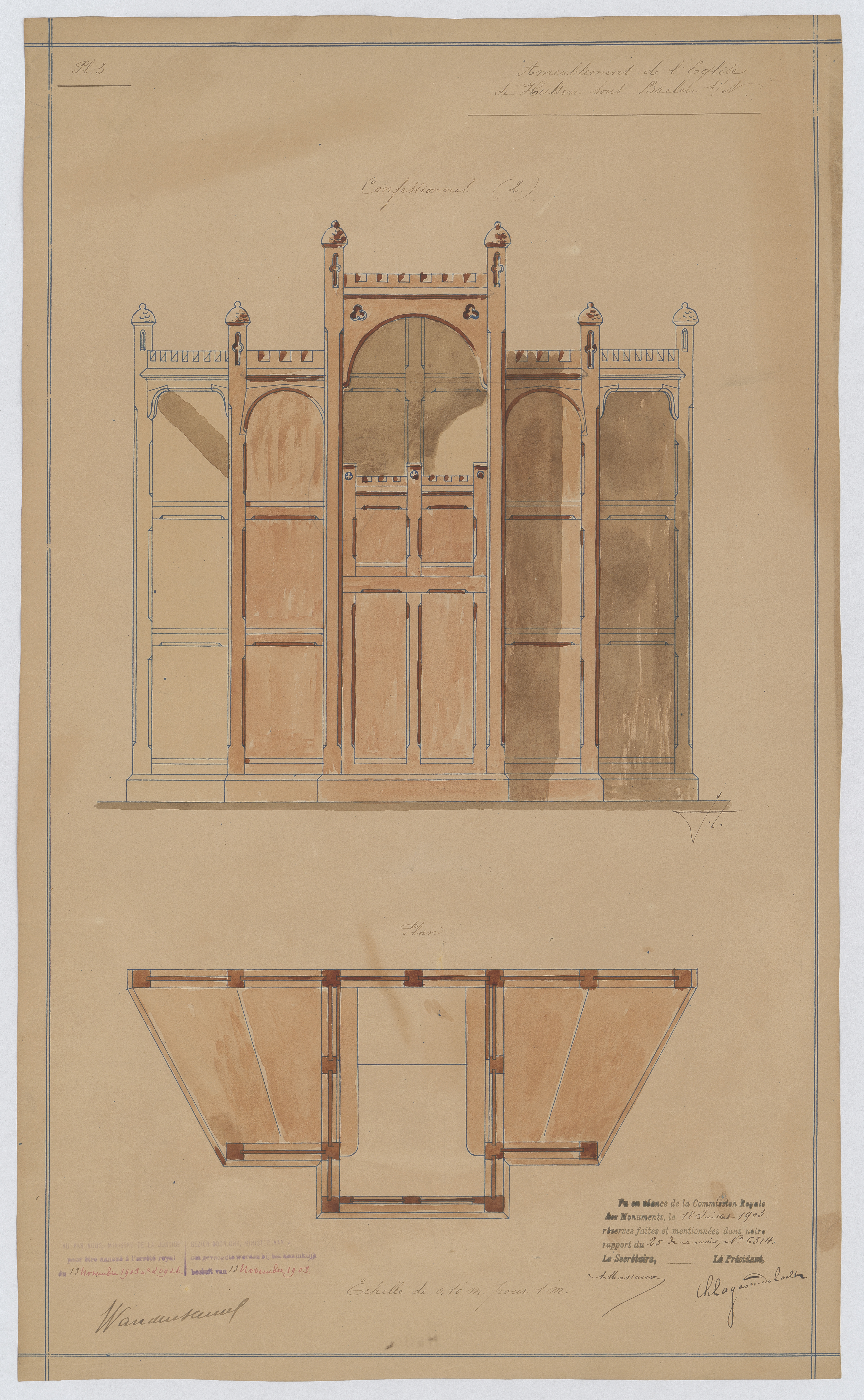 Opschrift: Projet pour l'ameublement de l'Eglise de Hulsen sous Baelen s/N. Omschrijving plan: vooraanzicht en plattegrond biechtstoel Datum KCML: 18/07/1903 Archiefnummer: A0511