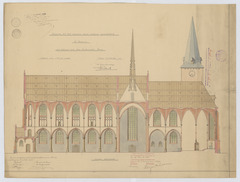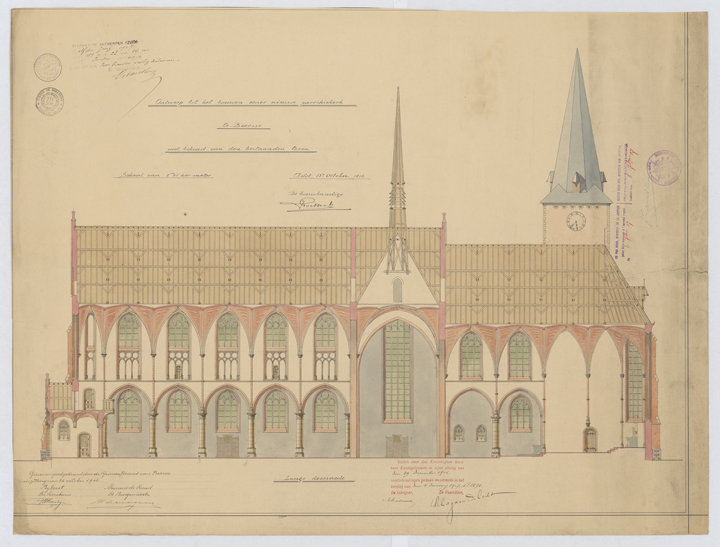 Opschrift: Ontwerp tot het bouwen eener nieuwe Parochiekerk te Beerse met behoud van den bestaanden Toren. Omschrijving plan: langsdoorsnede Datum KCML: 29/12/1906 Archiefnummer: A0529