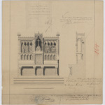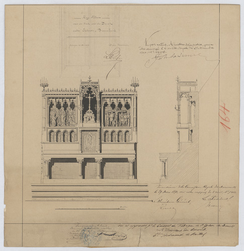 Opschrift: Hooge altaar voor de kerk van de Donck onder Eeckeren & Brasschaet. Omschrijving plan: voor- en zijaanzicht altaar Datum KCML: 24/03/1890 Archiefnummer: A0591