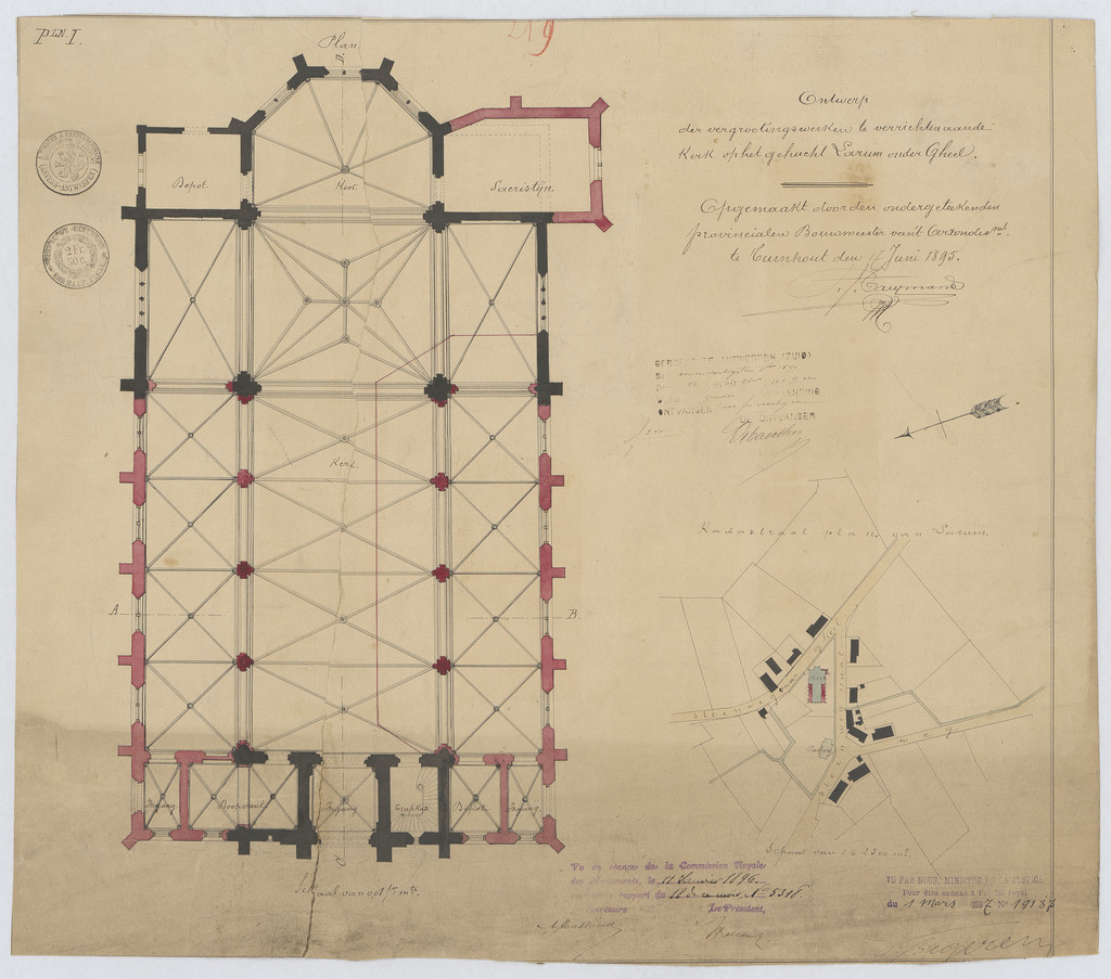 Opschrift: Ontwerp der vergrootingswerken te verrichten aande kerk op het gehucht Larum onder Gheel. Omschrijving plan: plattegrond niveau 0, situatieplan Datum KCML: 17/01/1896 Archiefnummer: A0672