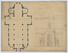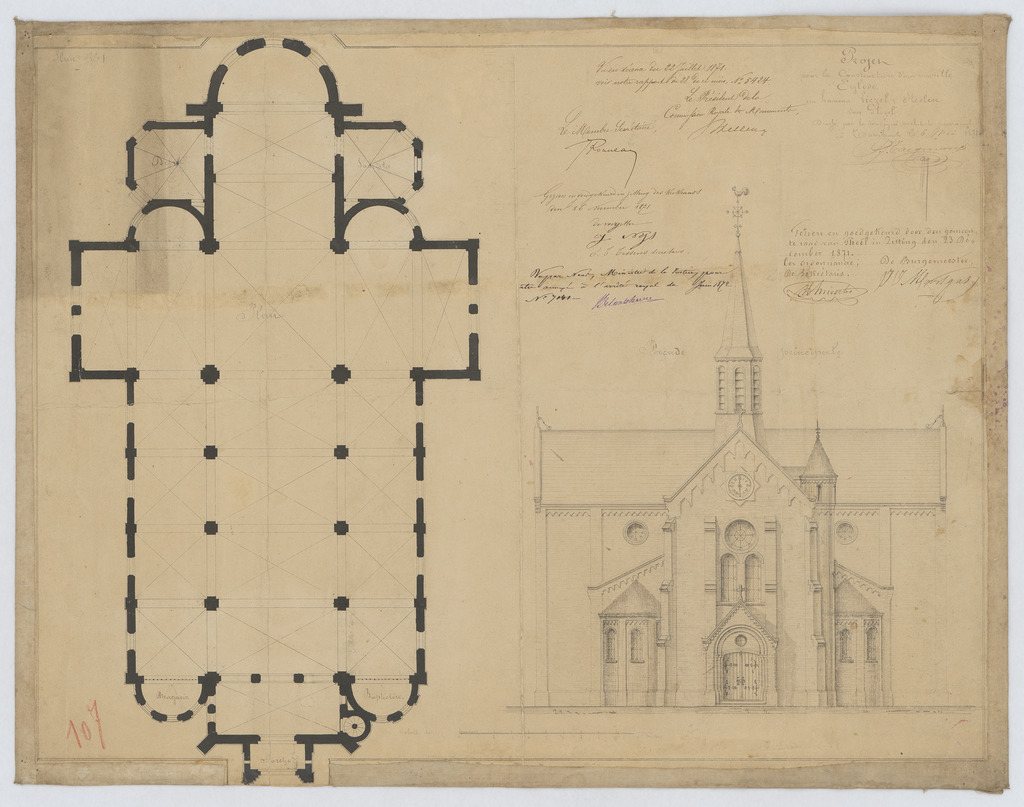 Opschrift: Projet pour la construction d'une nouvelle Eglise au hameau de Liezel & Steelen sous Gheel. Omschrijving plan: plattegrond niveau 0, opstand voorgevel Datum KCML: 22/07/1871 Archiefnummer: A0688