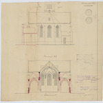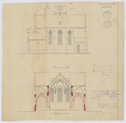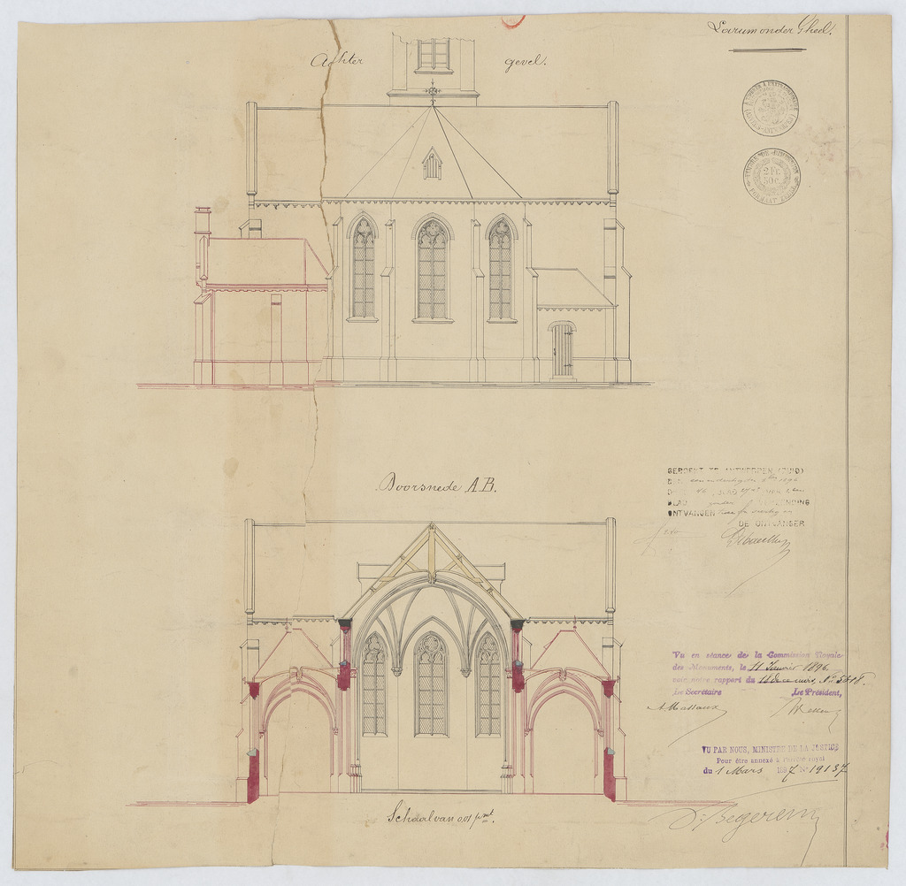 Opschrift: Kerk te Larum onder Gheel. Omschrijving plan: opstand achtergevel, dwarsdoorsnede Datum KCML: 17/01/1896 Archiefnummer: A0675