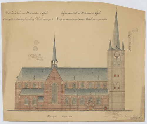 Opschrift: Parochiale kerk van St. Amandus te Gheel. Ontwerp tot de uitwendige herstelling. Eglise paroissiale de St. Amand à Gheel. Projet de restauration extérieure. Omschrijving plan: opstand N-gevel Datum KCML: 11/05/1907 Archiefnummer: A0632